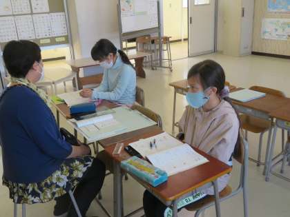 国際室 算数の授業風景です。取り出しを行い、2名の子が、担当の先生から算数の個別支援を受けていました。