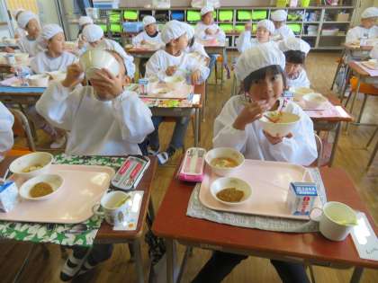 給食の様子です。今日のメニューは、竹の子御飯、牛乳、黒はんぺんnお茶フライ、豚汁です。写真は1年月組の様子です。会話は控え、味わいながら、静かに食べていました。黒はんぺんが人気のように見えました。