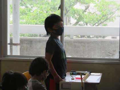 1年月組 算数の授業風景です。今日は、合わせて8になる二つの数と9になる二つの数を考えました。子どもたちがもっている教具は、貯金箱のようになっています。中で区切られていて、おはじきの入れ方によって8枚入れたとしても(1,7)(5,3)(4,4)などいろいろなパターンが起こりえます。何回も繰り返し行ったり、友達と比べたりして、いろいろな組み合わせがあることを理解していました。