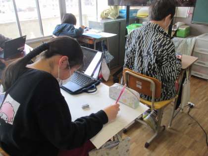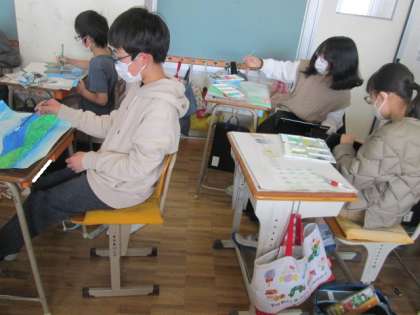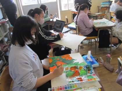 6年生の図工の様子です。テーマは「沼津の風景」です。それぞれが「きれい」「心に残っている」と感じた風景を描いて、彩色していました。水彩絵の具を上手に使って、きれいな色で彩色していました。
