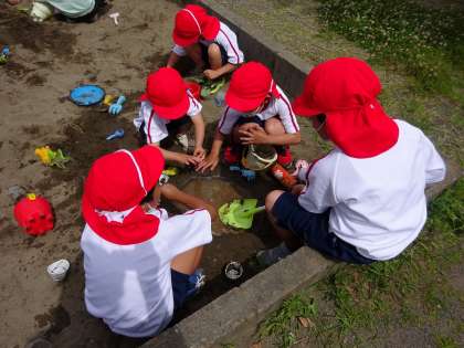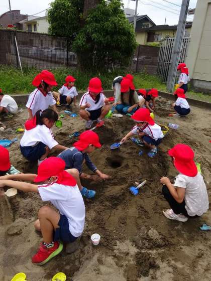 図画工作の学習で、砂場で遊びました。友達と一緒に大きな山や池を作ったり、カップやバケツでケーキを作ったりしました。重たい水も何度も運び、流れる様子を楽しんでいました。