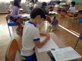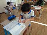 硬筆です。お手本を見て一画一画、丁寧に書いています。真剣な表情で取り組んでいます。