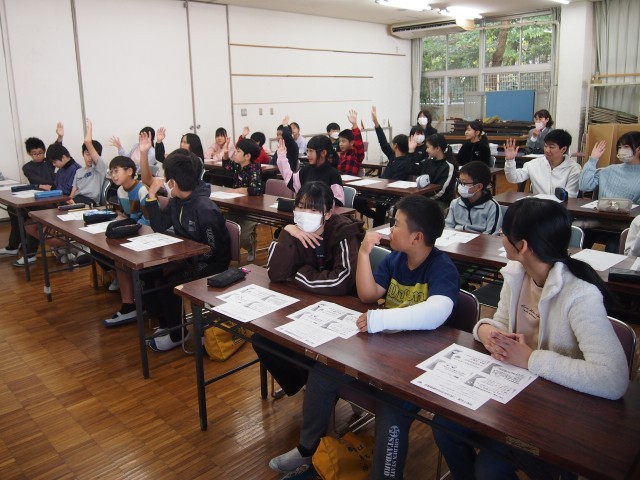 今日は、市内の2年目の中学校の先生が千本小に来て勉強をする研修会があり、その中心授業でした。