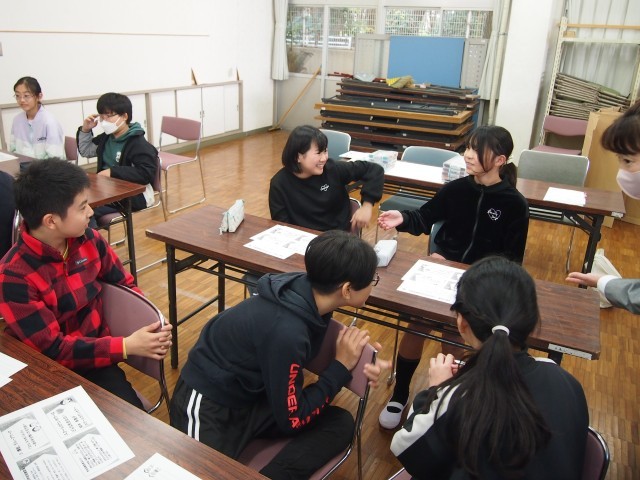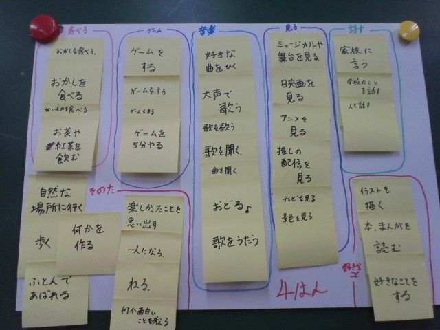 事前アンケートの結果やスクールカウンセラーさんのお話を聞いたり、自分を元気にする方法についてグループワークを行ったりしました。