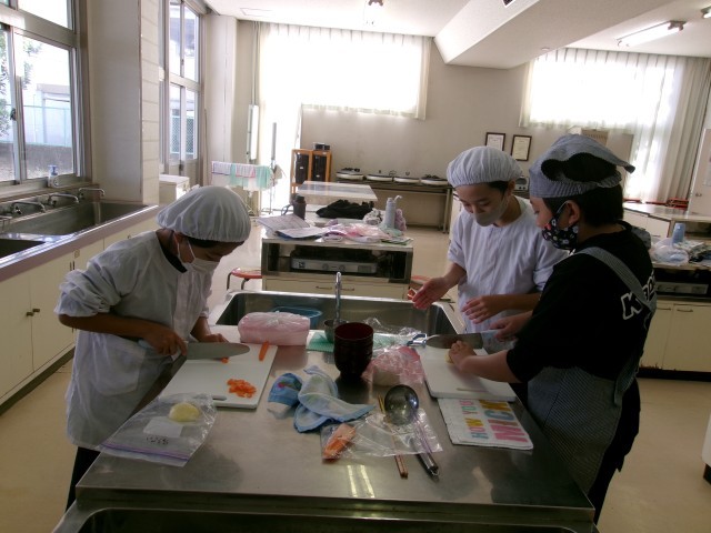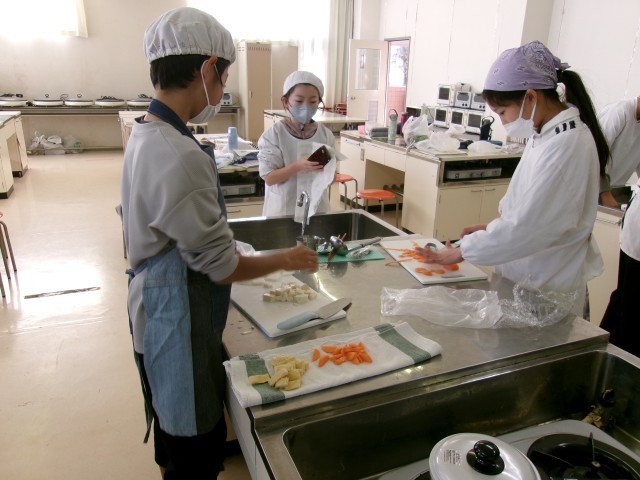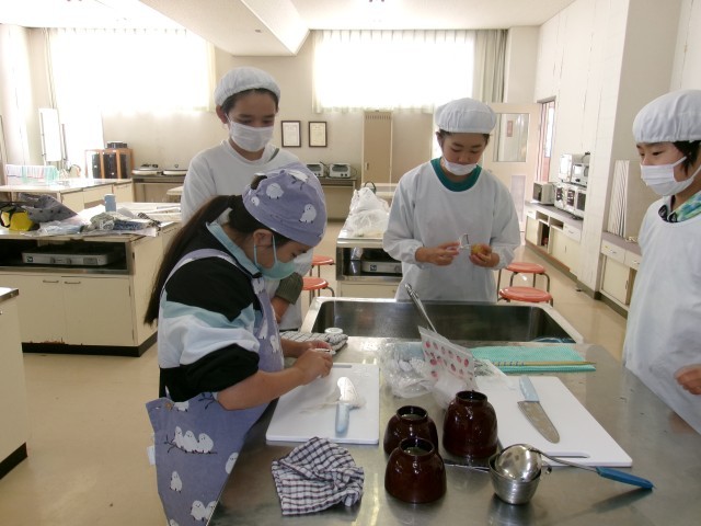 調理実習の様子です。味噌汁を作りました。だしをとるところから行っています。おいしい味噌汁ができるように、みんな真剣に調理に取り組みました。