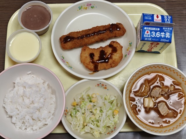 おまけに、今日はセレクト給食でした。メインはチキンカツか太刀魚フライのどちらかを、デザートはココアプリンかミルクプリンのどちらかを選択しました。