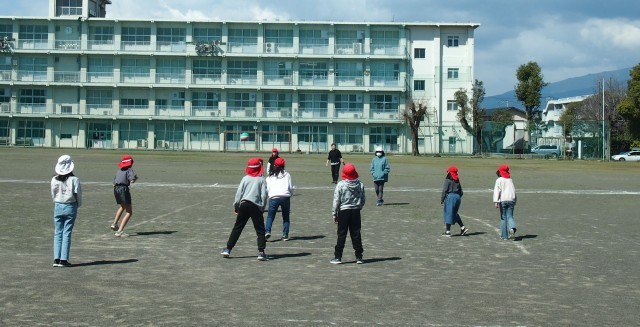 教科の学習内容がほぼ終わった5年生は、運動場でドッジボールをしていました。