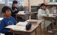 一年間の変化を「季節と生き物」として観察してきた4年生は、さいごの「春の訪れ」のカードをまとめ、一年間の変化が分かる本に仕上げていました。