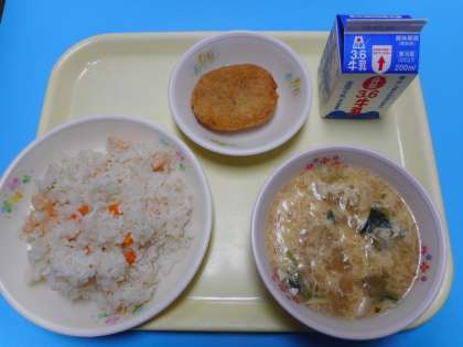 エビピラフ、カボチャと豆のコロッケ、とうがんのスープ、牛乳です。