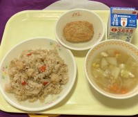 メニューは、自校炊飯、かれい米粉竜田揚げ、かぼちゃのそぼろ煮、里芋と豆腐の味噌汁、牛乳でした。