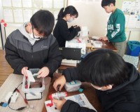 袋の脇をミシンがけし、開け口の作業に入りました。協力して作業を進め、完成第一号が誕生しました。