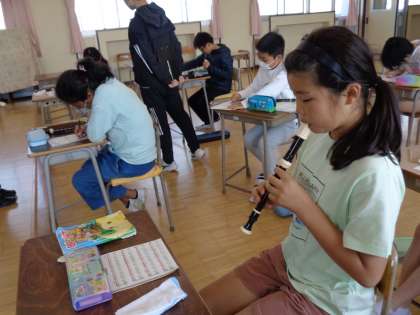新しい、リコーダー演奏曲に挑戦です。ソの音のフラットが初めて出てきました。指を確かめながら、友達と同じ音となっているか聞き合っていました。来週は、きれいなハーモニーとなっていることでしょう。