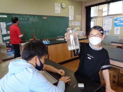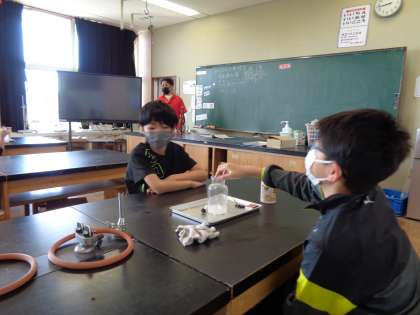 物を燃やした後の空気についての実験です。気体検知管で集めた空気は、石灰水を白く濁らせていました。とすると・・・子どもたちは考え始めています。
