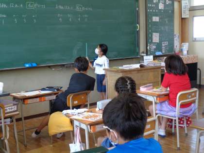 12枚の折り紙を4人に分けるにはどうしたらいいのか、一人一人自分の考えを友達に伝えています。