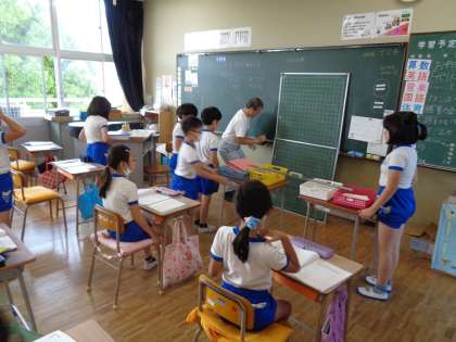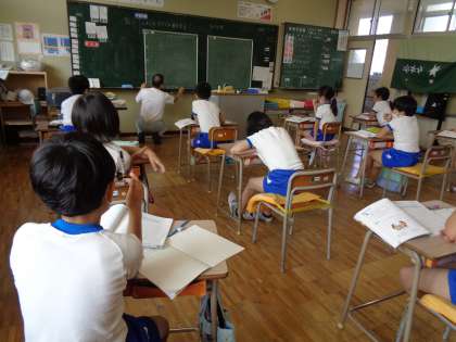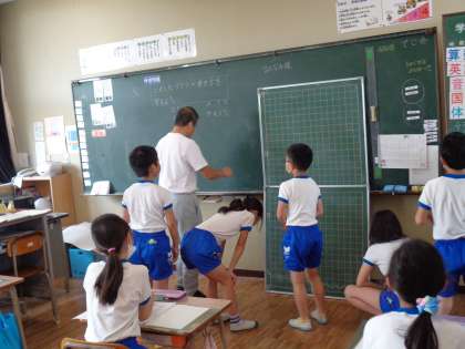 「なみなみ線って何?どんな意味があるの?」と、グラフを実際に描きながらみんなで考えていました。ます目の黒板を二枚使って描いていくと、より近くでグラフを見て考えようと、自然と子どもたちは黒板の前に集まっていました。「自ら考え」ている姿が見られています。