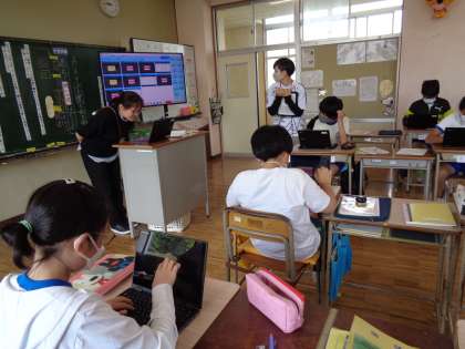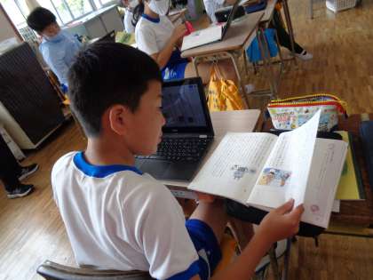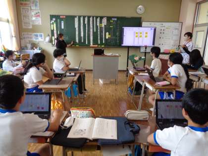 説明文の文章構成を考えています。「問いの文」特有の言葉を手がかりに、自分の考えをChromebookに書き込んでから話し合っていました。最後は本文に戻って確認です。