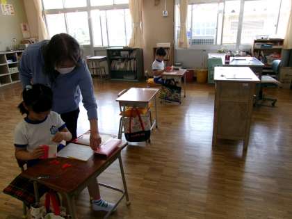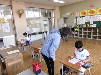 1年生の教室では、算数「いくつといくつ」の学習をしていました。おはじきを使って確かめたり、頭の中でよく考えて答えをだしたりしていました。じっくり学習することができています。