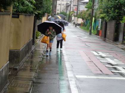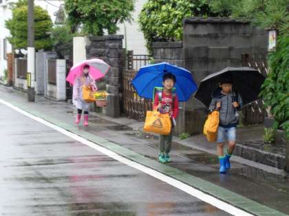 傘を差し合羽や長靴でぬれないように歩いていました。