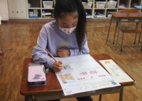 書写の学習が終わると、頑張ったご褒美に読み聞かせのプレゼントもありました。子供たちに人気の「だるまちゃん」シリーズのお話でした。3人は、近づいて絵を見ながらじっくりと聞いていました。