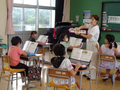 「ゆかいな木琴」の曲の、鍵盤ハーモニカのパートに挑戦しています。「ゆかいな木琴」は軽快で楽しい曲なので、子供たちはテンポよく弾くことができるようになりたいと、先生の指の動きを一生懸命にまねて練習をしていました。