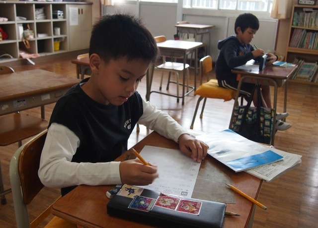 1年生は、算数のプリントと計算ドリルに取り組みました。