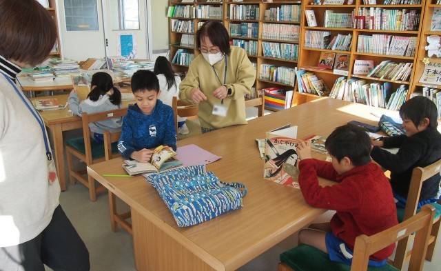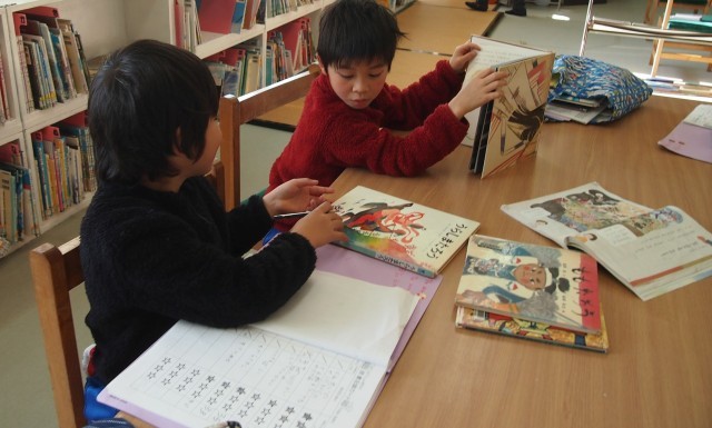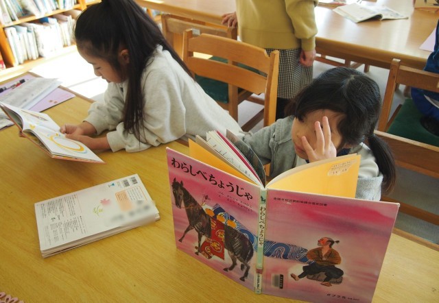 図書館で司書の先生が用意してくれた昔話を読んで、面白かった話を選び好きなところを友達に伝える準備をしました。