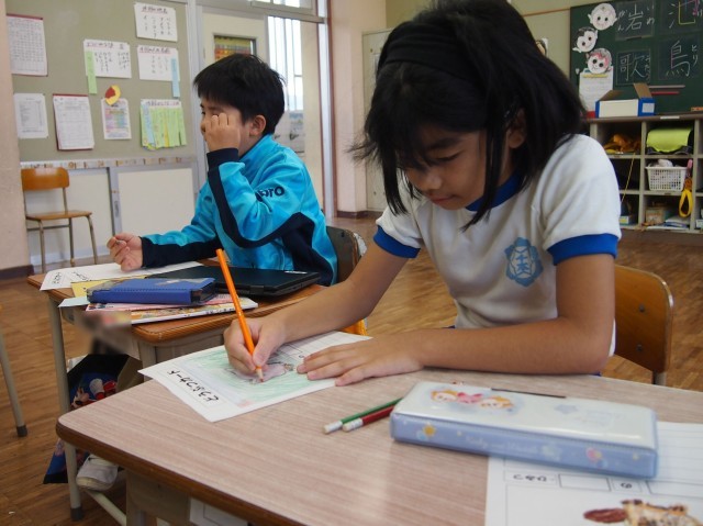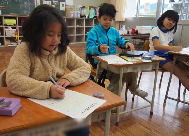 2年生の国語の様子です。「つながりを考えながらお話を書きましょう」という学習です。4コマのつながるイラストを見て、空いているコマは、どのような展開になるのか予想し、絵やコメントをかいていました。