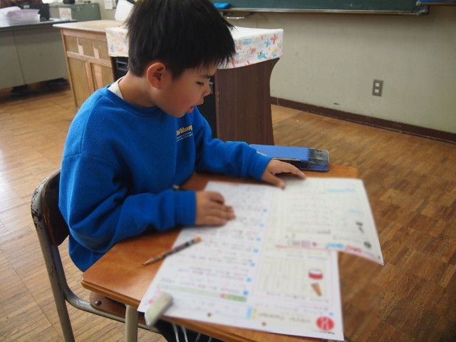 昨日お休みしていた子は、漢字と計算のテストに取り組みました。
