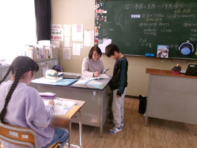 4年生の理科の様子です。「季節と生物」のまとめをしていました。問題を解くと、先生に丸付けをしてもらいました。
