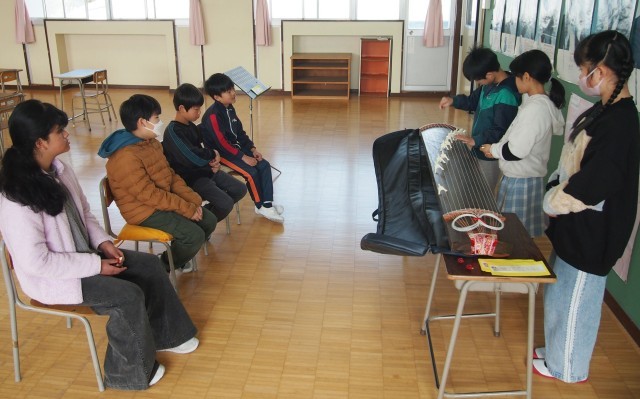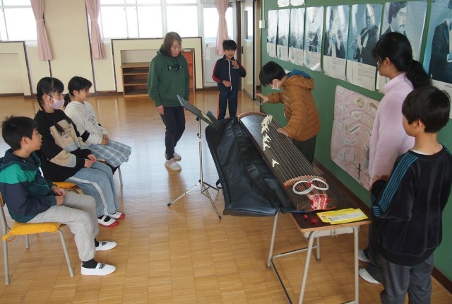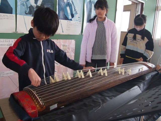 後半は、学校の備品の琴で「さくらさくら」の演奏に挑戦しました。