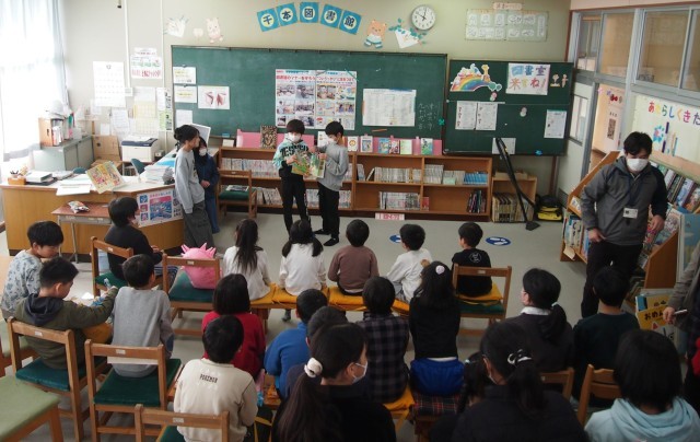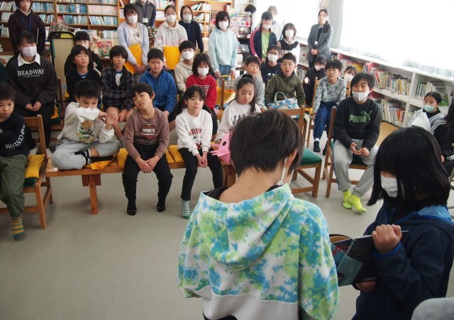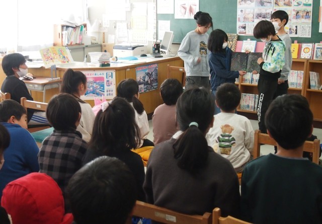 5年生の読解「学校を百倍素敵にする方法」の一環で、読み聞かせを行うことにしたグループが、20分休みに全校に呼び掛け、絵本の読み聞かせをしました。