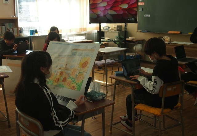 今日は、「校舎の絵」について、自分の絵の振り返りと友達の絵の良いとこ見つけをしました。