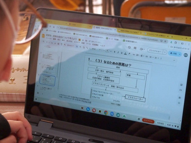 なりたい職業に向けて、仕事内容やなるために必要なことを調べ、スライドにまとめています。
