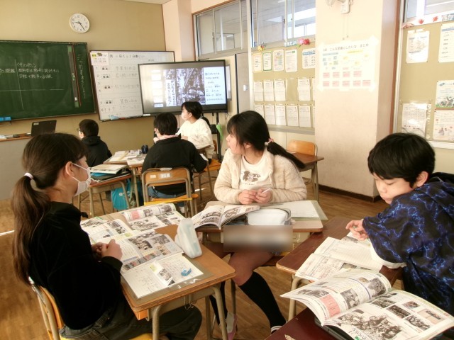 6年生の社会の様子です。第二次世界大戦中、国民はどのような生活をしていたのか「衣・食・住」の観点から調べました。学習により、子供たちは平和の大切さを感じていました。