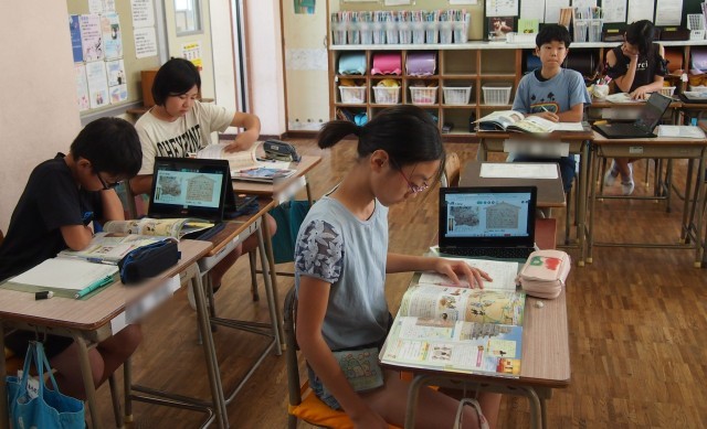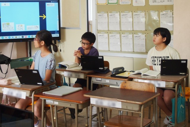 Meetとロイロノートの組み合わせで、第一小、第二小とオンラインでつなぎ、合同授業を行いました。