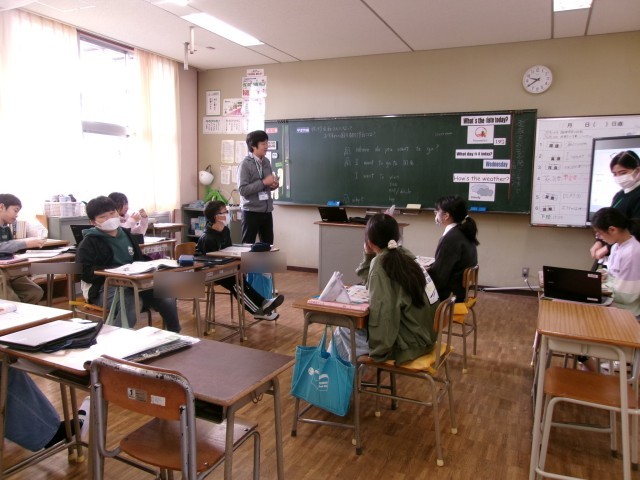 6年生の英語の様子です。「旅行会社の人になって、おすすめの国を紹介する」という学習をしていました。はじめに、行ってみたい国や、そこで食べたいものなどについて、友達にインタビューしました。