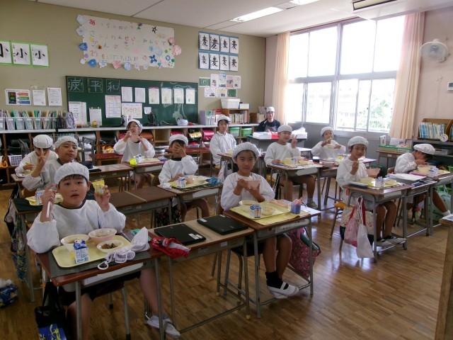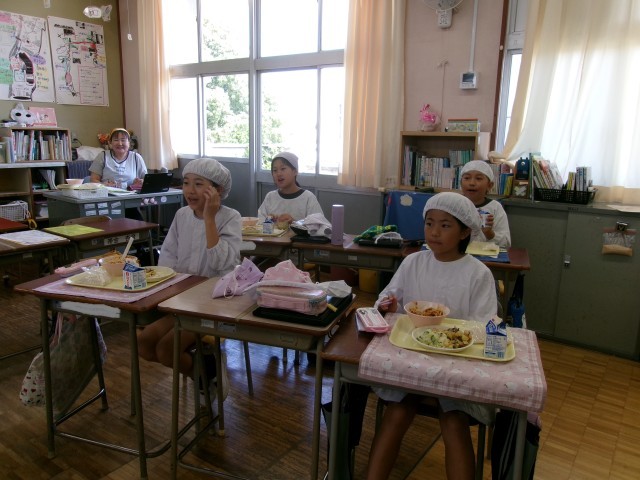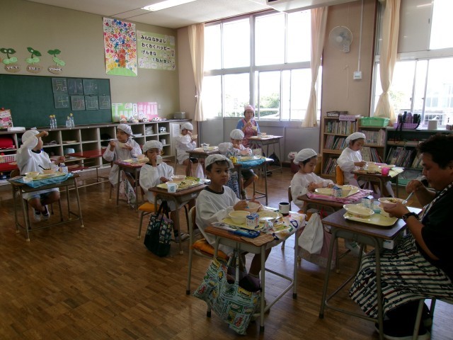 2年生が3・4年生の教室で一緒に給食を食べました。