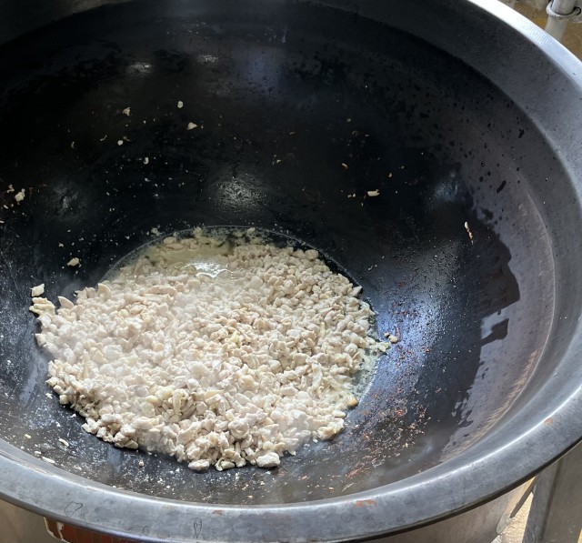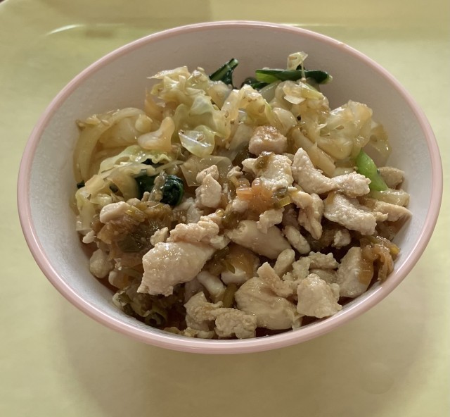 ①ルーローハンは鶏の胸肉の細切れを酒・砂糖・しょうがにつけ込み肉を柔らかくします。