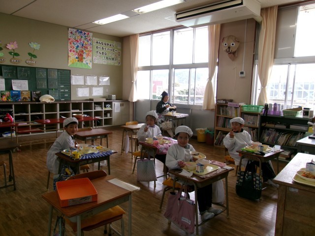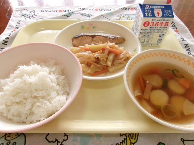 全校スイミングから帰ってきてすぐに給食です。とても慌ただしく始まりますが、今日は温かいお味噌汁に喜んでいました。