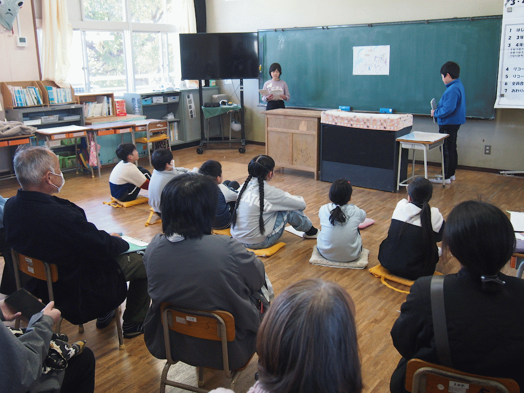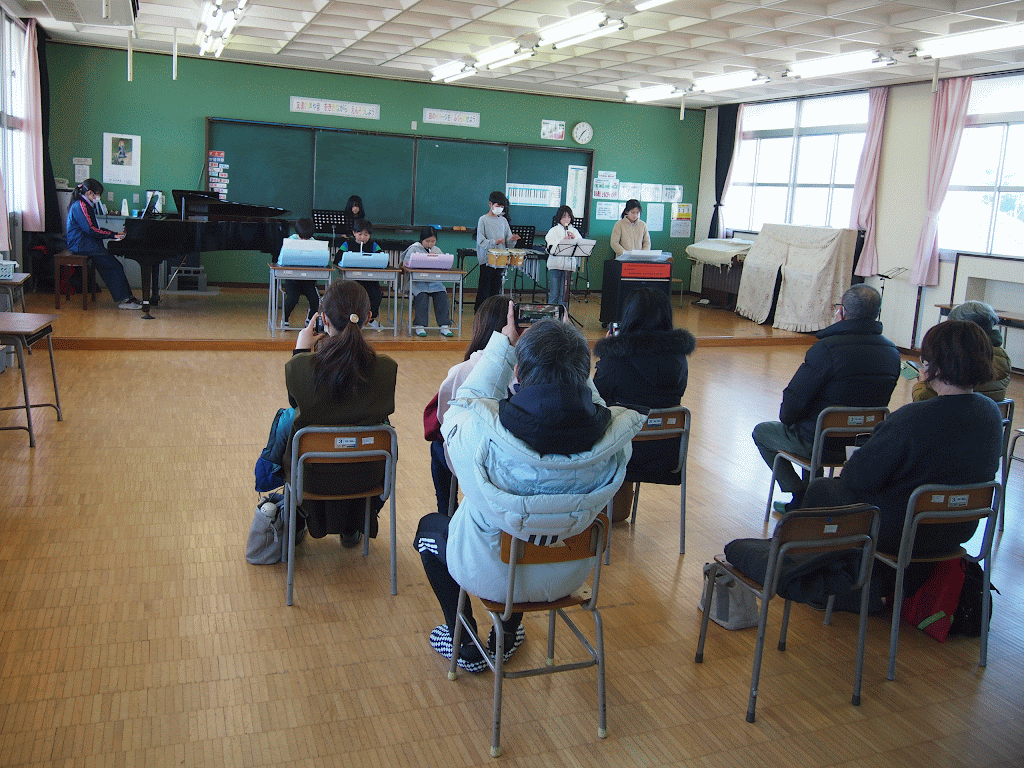 1年生は昔話の紙芝居、2年生は自分探しを発表しました。また、1・2年生合同で、鍵盤ハーモニカの演奏と歌を披露しました。