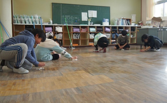 お世話になった教室のワックスがけの他、来週卒業する6年生が証書授与の際に歩く花道に敷く赤いカーペットの埃取りなどを行いました。