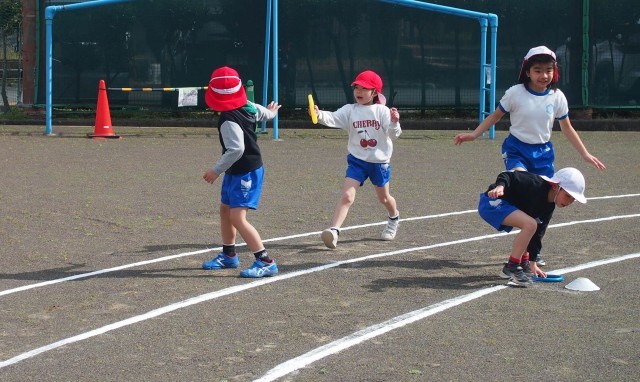 タグラグビーの要領で行う宝運びゲームを少しアレンジし、タグの代わりに旗を腰に付けてみました。