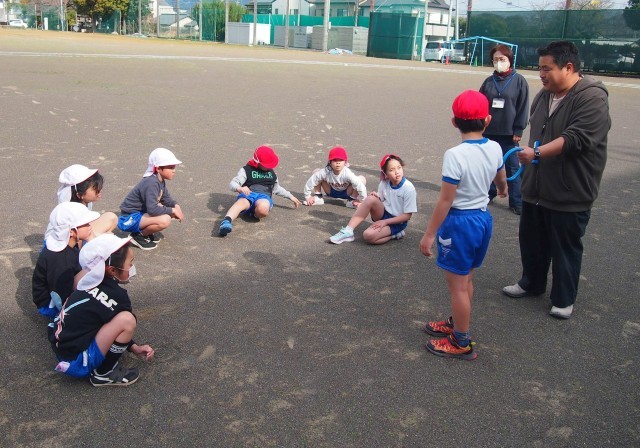 教室で、ルールや学習の流れを確認してから運動場に移動しました。