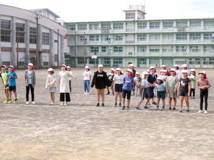 全校遊び2つ目は、「かくし鬼(鬼ごっこ)」。鬼は、ボールやフィルムケースなどを持っている人です。持っているかどうか、隠したまま近づいて来るので、近づいてくる人みんなが鬼に見えてしまうゲームです。