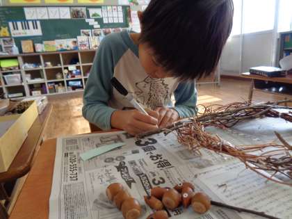 朝顔のつるを使ったリースに飾り付けをしています。どんぐり、松ぼっくり、小枝、落ち葉など、秋がいっぱいのリースになりそうです。