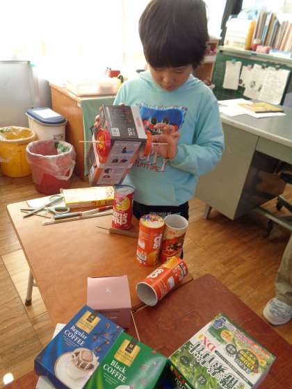 動くおもちゃを作っています。ふれあいの日にみんなに作ったおもちゃで遊んでもらうためです。牛乳バックや紙コップ、空き箱、空きカップ、など身近な材料を使って、ゴムや風の力を生かしたおもちゃを作っていました。うまくいかないときは、まずは友達と相談です。大体のことはこれで解決しますね。どんなおもちゃが出来上がるのか楽しみです。