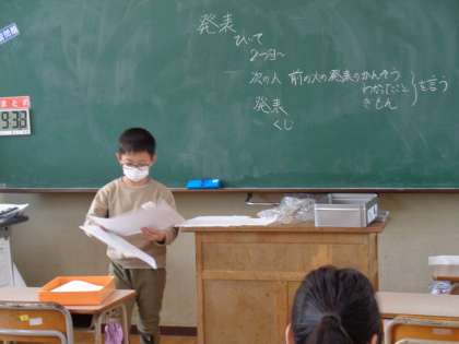 国語の学習で、気になることを調べて、伝わりやすい文章をつくりました。今日は、その発表会です。順番は、くじで決めます。いつ自分が当たるか、緊張しながら、しかも真剣に友達の発表を聞いていました。なぜかというと、発表の前には、前の友達の発表について感想や質問もしなければならないからです。この緊張感は、子どもたちの気持ちに張りを持たせていました。友達の発表が終わると、大きな拍手も響いていました。