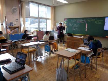 5年生の教室では、2学期の学者鵜や生活を振り返って、活動について自己評価していました。用紙に記入か、データ入力をどちらか選択し、先生に提出していました。振り返った内容は先生と確認です。 -