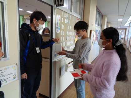 今日は、頑張って取り組んだビンゴカードを、企画委員が各学級にご褒美プレゼントを持って返却にいきました。1年生は、自分の名前が呼ばれると、にっこりしていました。企画委員は、「これからも、すすんであいさつをしていきましょう。」といいながら、ご褒美を手渡していました。 -