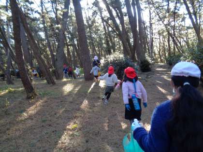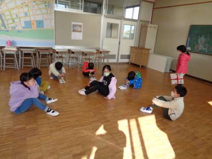 ゲームは、ハンカチ落としではなく「プレゼント落とし」です。子どもたちは面白いもので、落とされたハンカチなら握りしめて走るのに、プレゼントとなると、プレゼントが大きいからでしょうか、ほったらかしで自分だけ逃げていくのでした。カード交換のプレゼントは、最後のお楽しみのようです。 -